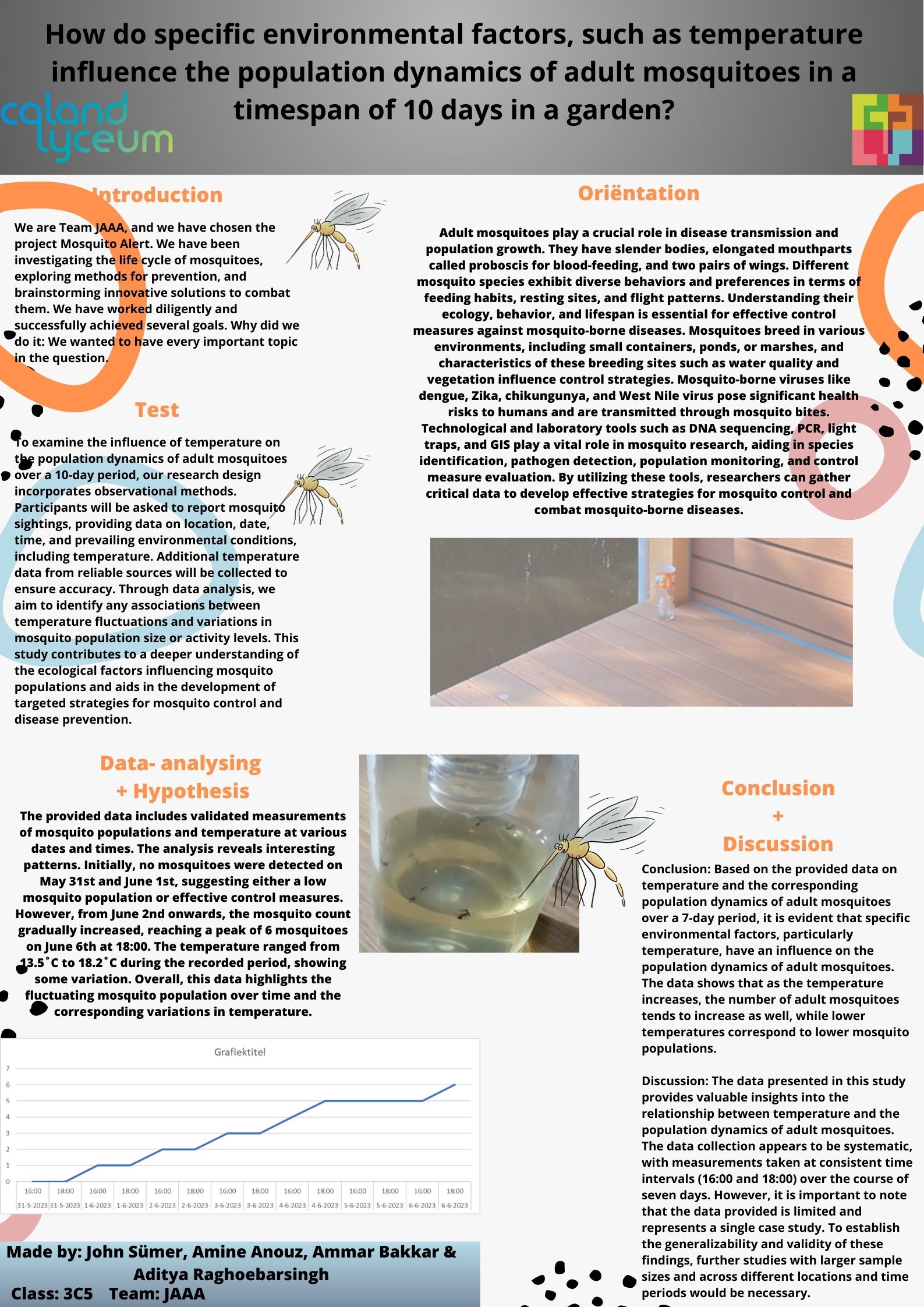 Onze opdrachtgever is Mosquito Alert. Zij zitten met een probleem dat muggen virussen overbrengen die schadelijk zijn voor de mens en andere organismen. Het team: Amine Anouz, Ammar Bakkar, John Sumer en ik moeten een onderzoek doen over de mosquito in Nederland. Het onderzoek moeten we verwerken in een verslag en in een poster, dit zijn onze eindproducten.